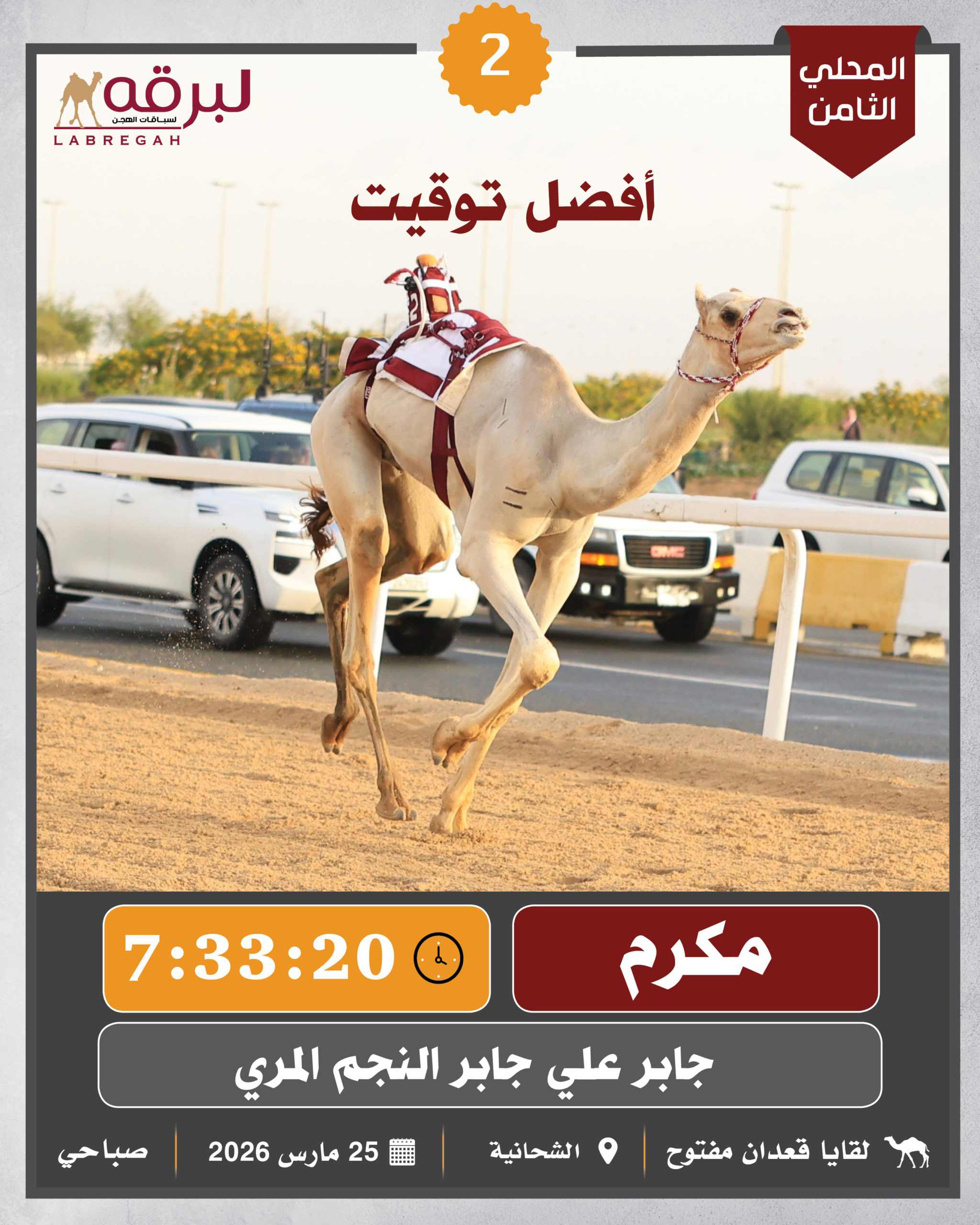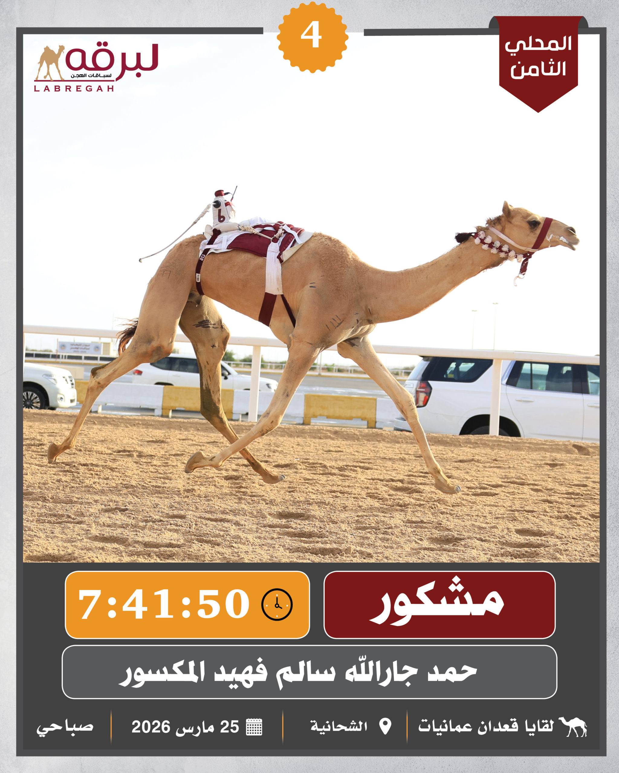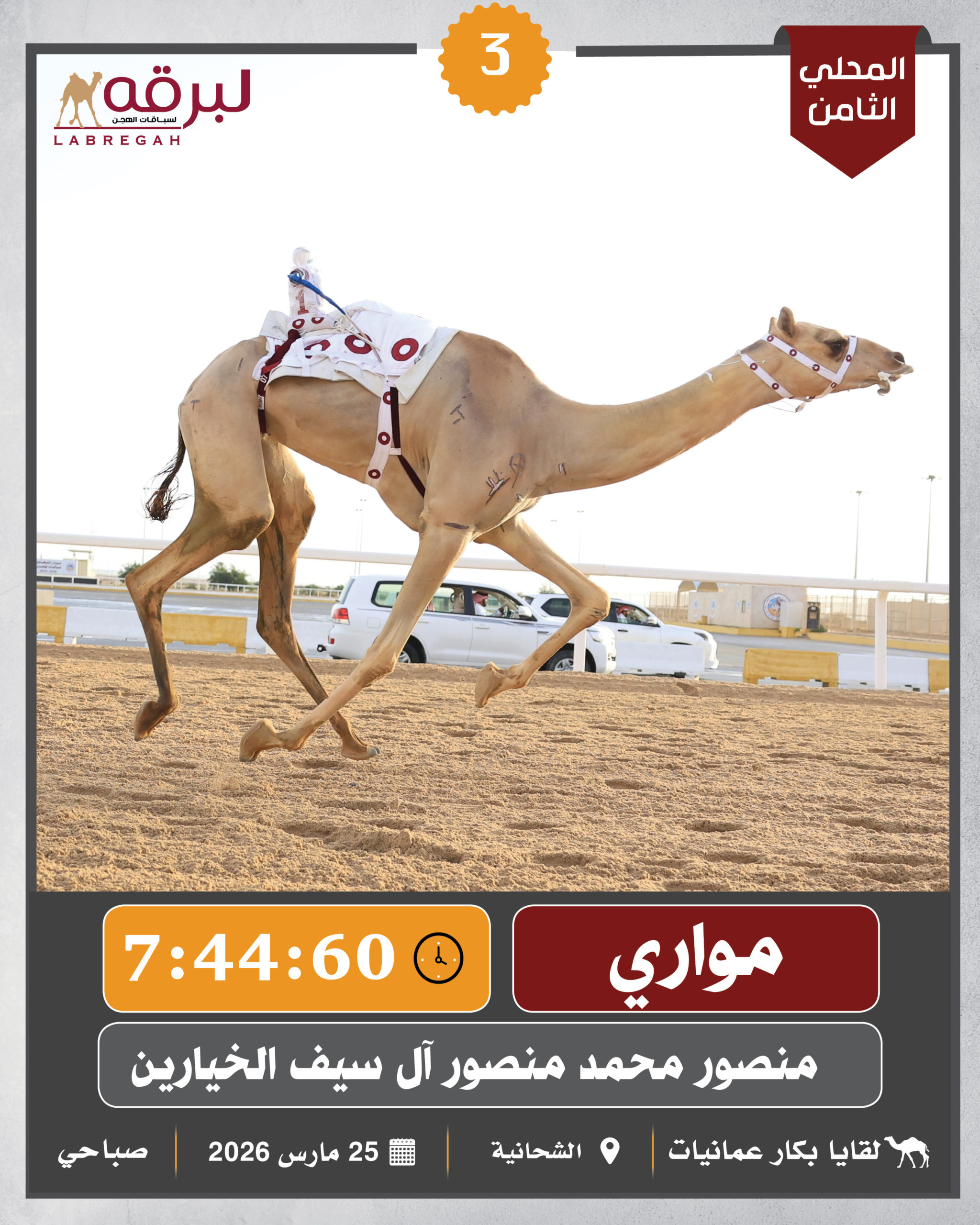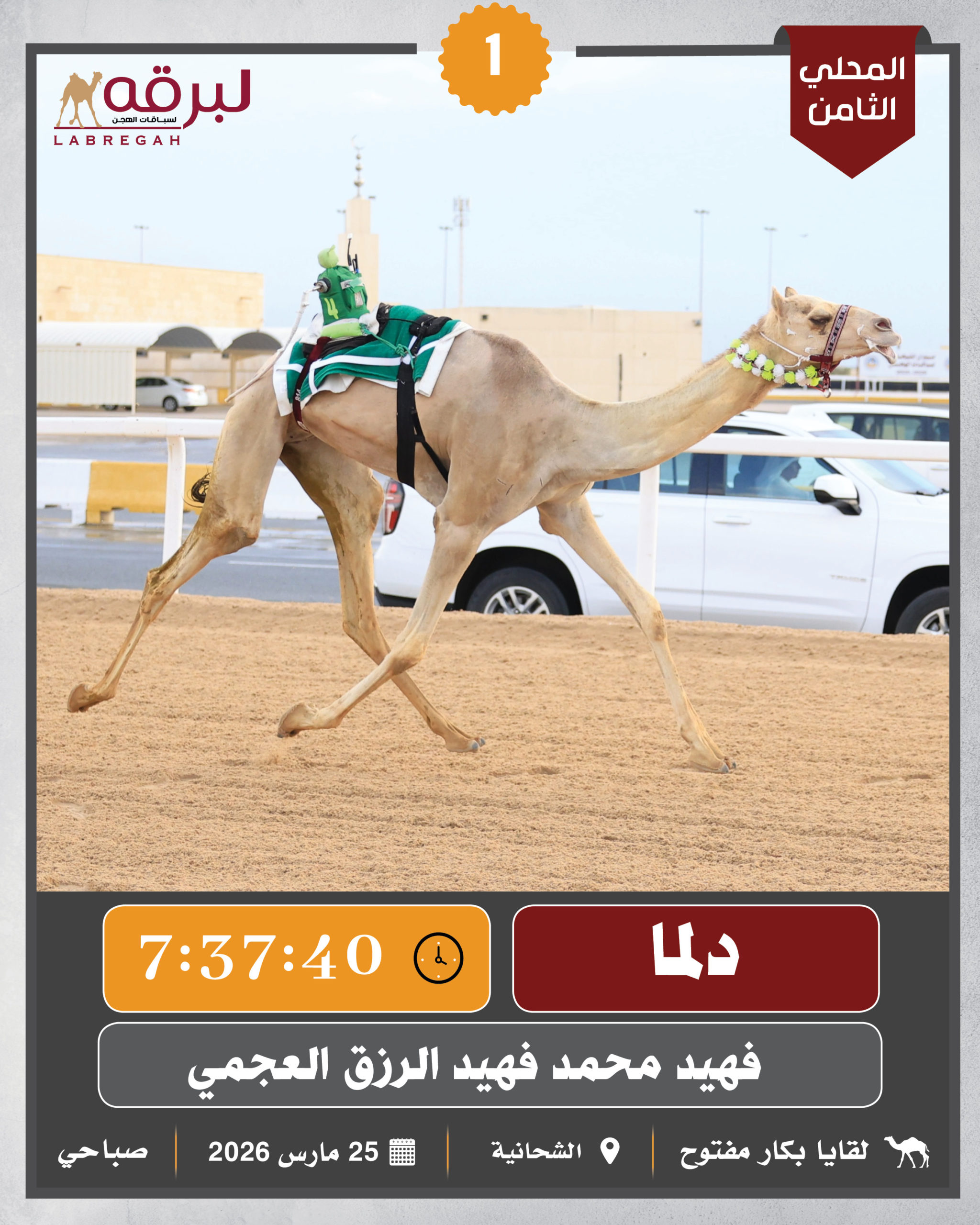 بمشاركة 600 مطية، أقيمت صباح اليوم الأربعاء 25 مارس 2026 فعاليات ومنافسات اللقايا العامة، ضمن برنامج السباق المحلي الثامن بالشحانية، حيث دارت معارك قوية بين الهجن المشاركة على مدار 22 شوطًا لمسافة الـ 5 كم، وفيها..