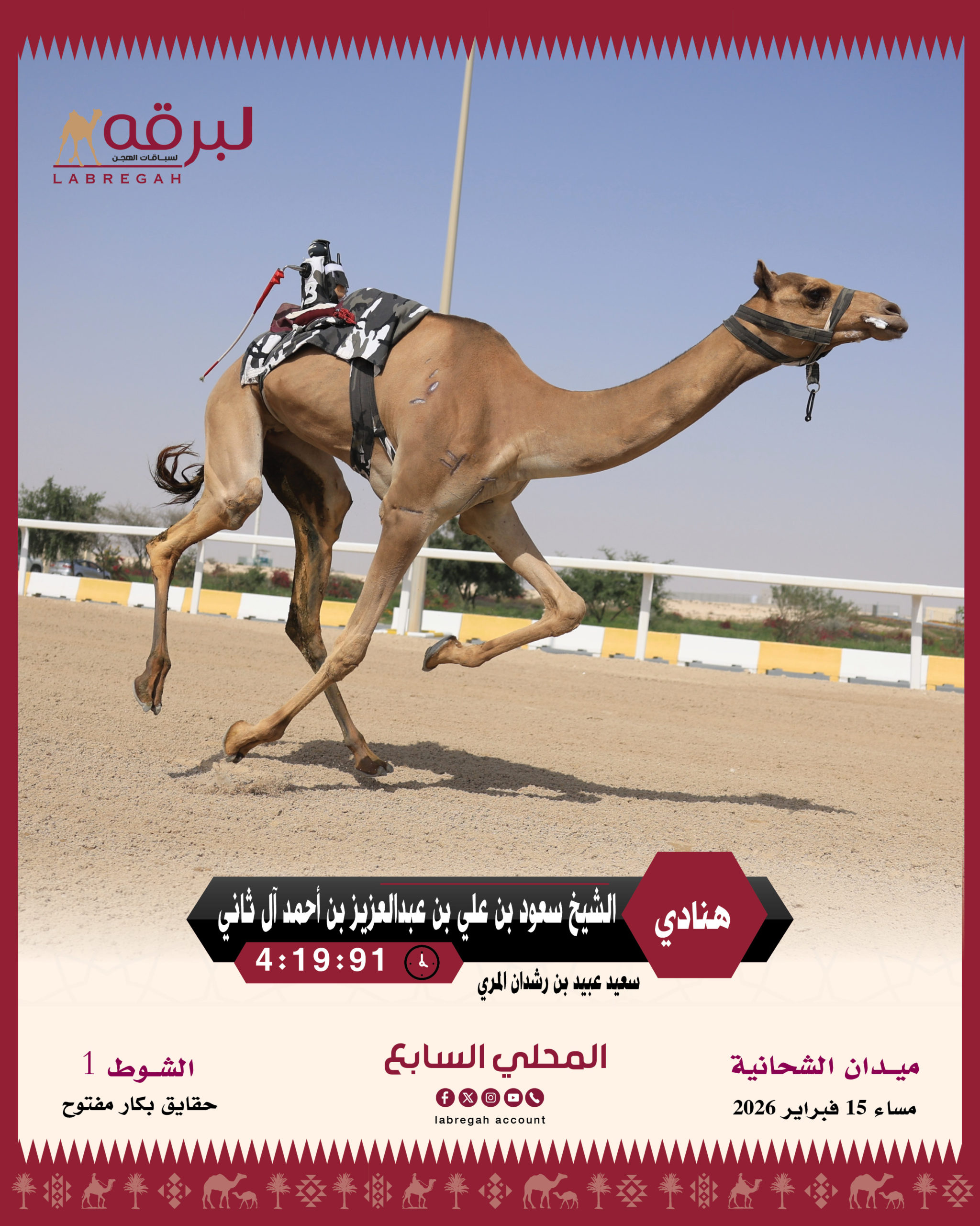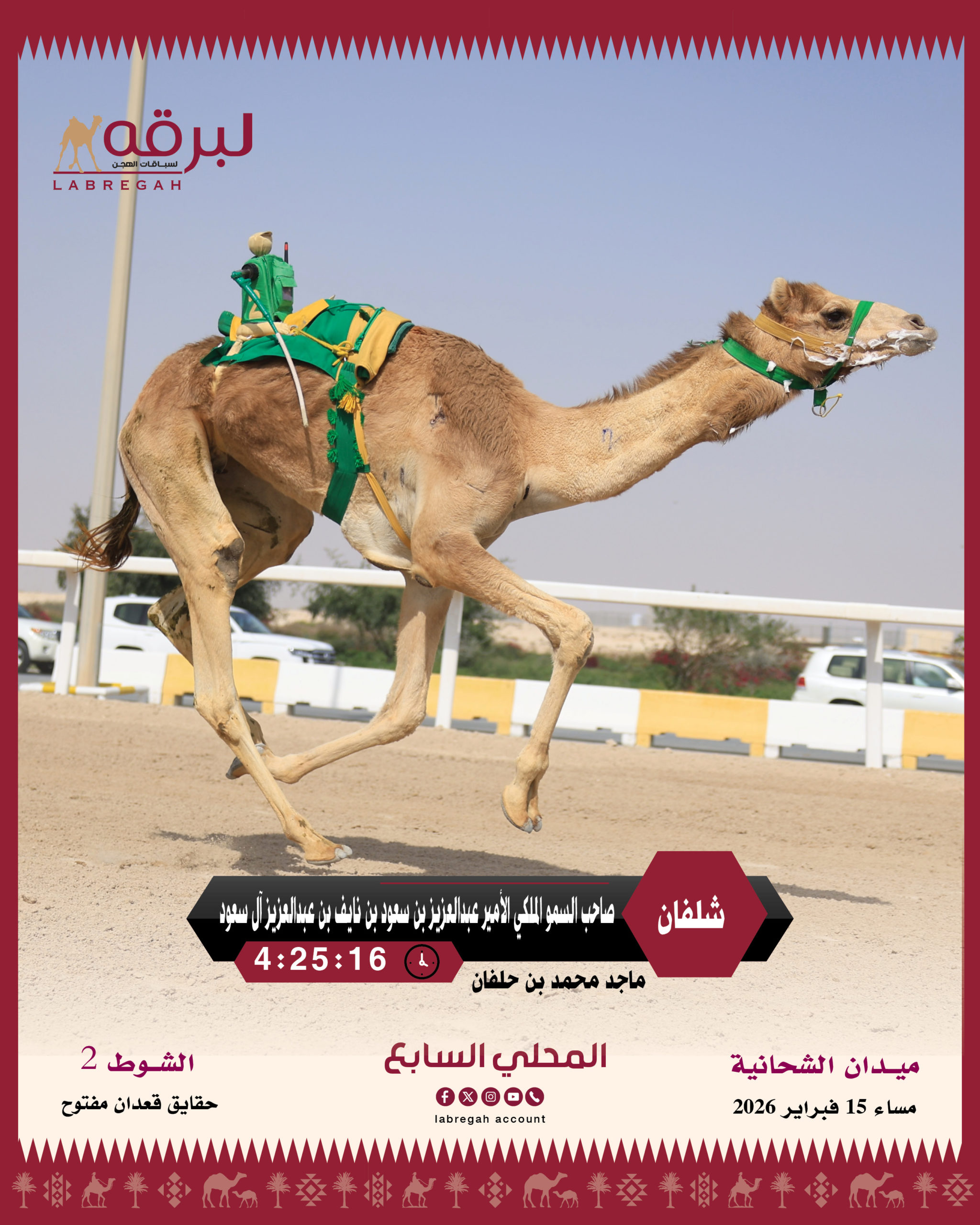 اختُتمت مساء اليوم الأحد 15 فبراير 2026 منافسات المرحلة الأولى من السباق المحلي السابع، والمخصصة لهجن الأشواط المفتوحة المملوكة لأصحاب السمو والسعادة الشيوخ، لفئة الحقايق، حيث أُقيمت المنافسات على مدار 24 شوطًا من مسافة 3 كيلومترات.