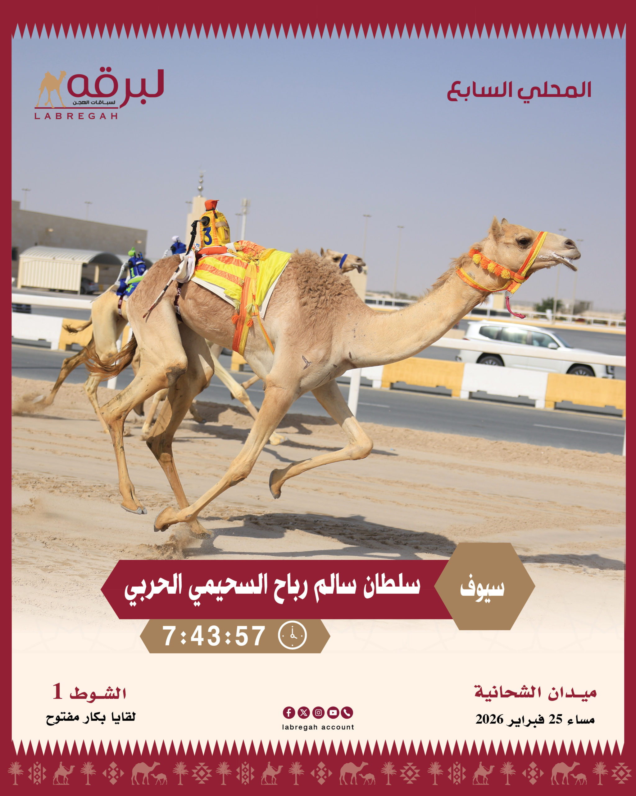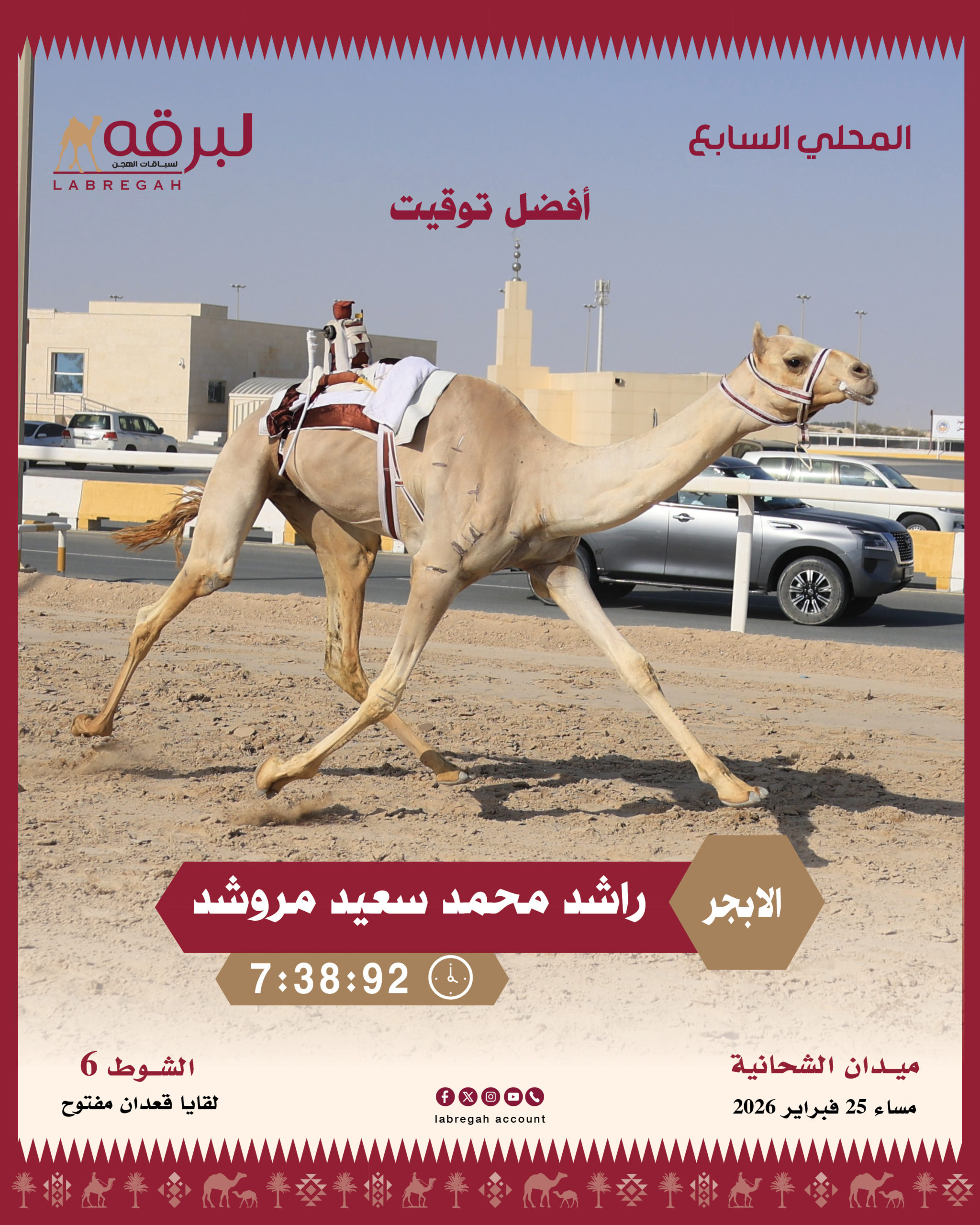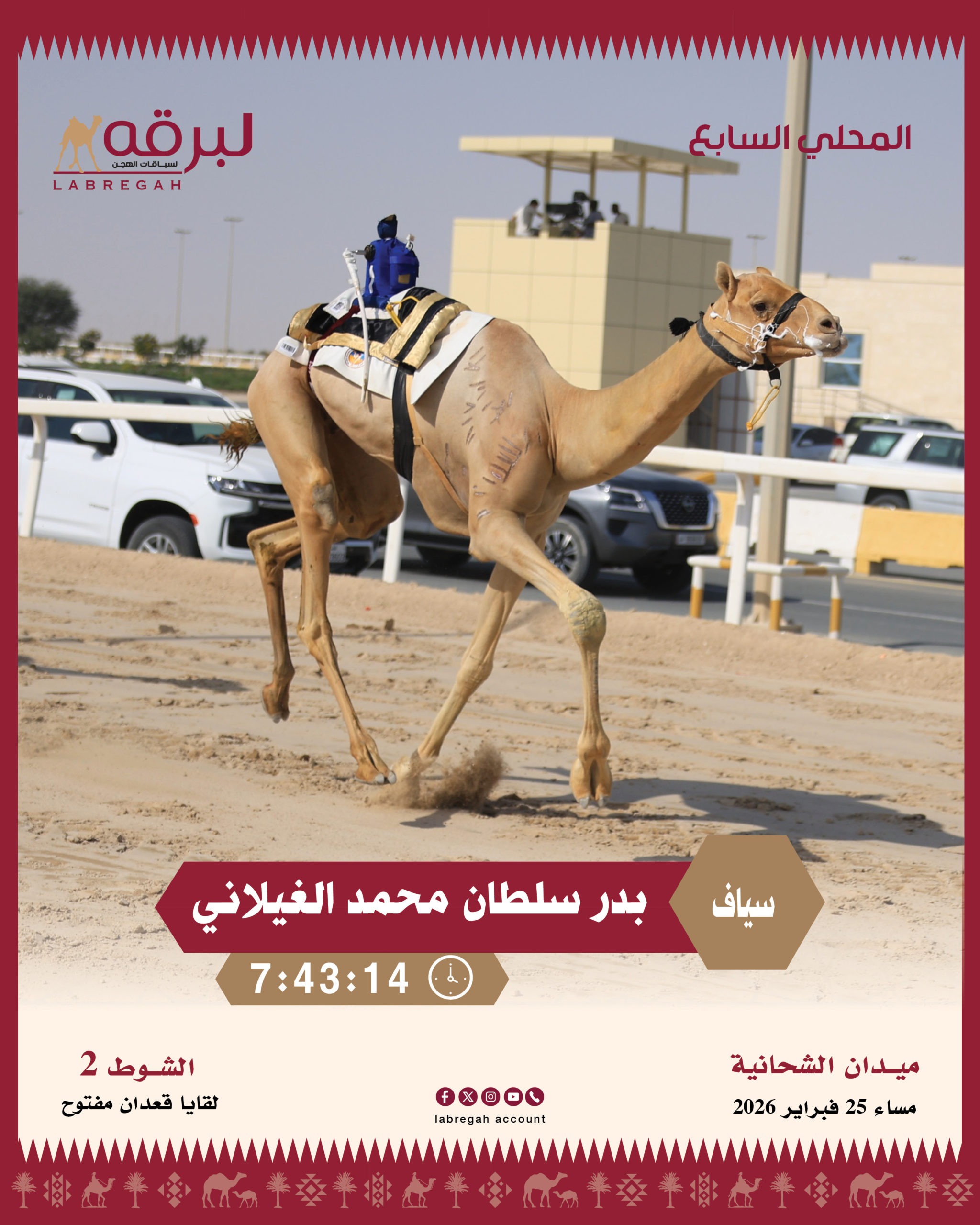 تواصلت مساء اليوم الأربعاء 25 فبراير 2026 منافسات السباق المحلي السابع في مرحلته الثانية، حيث خصصت تحديات الأمسية لسن اللقايا العامة المملوكة لأبناء القبائل من أبناء الشحانية وكذلك أبناء دول مجلس التعاون الخليجي، وشهدت مشاركة 457 بكرة وقعودًا عبر 14 شوطًا لمسافة خمسة كيلومترات.