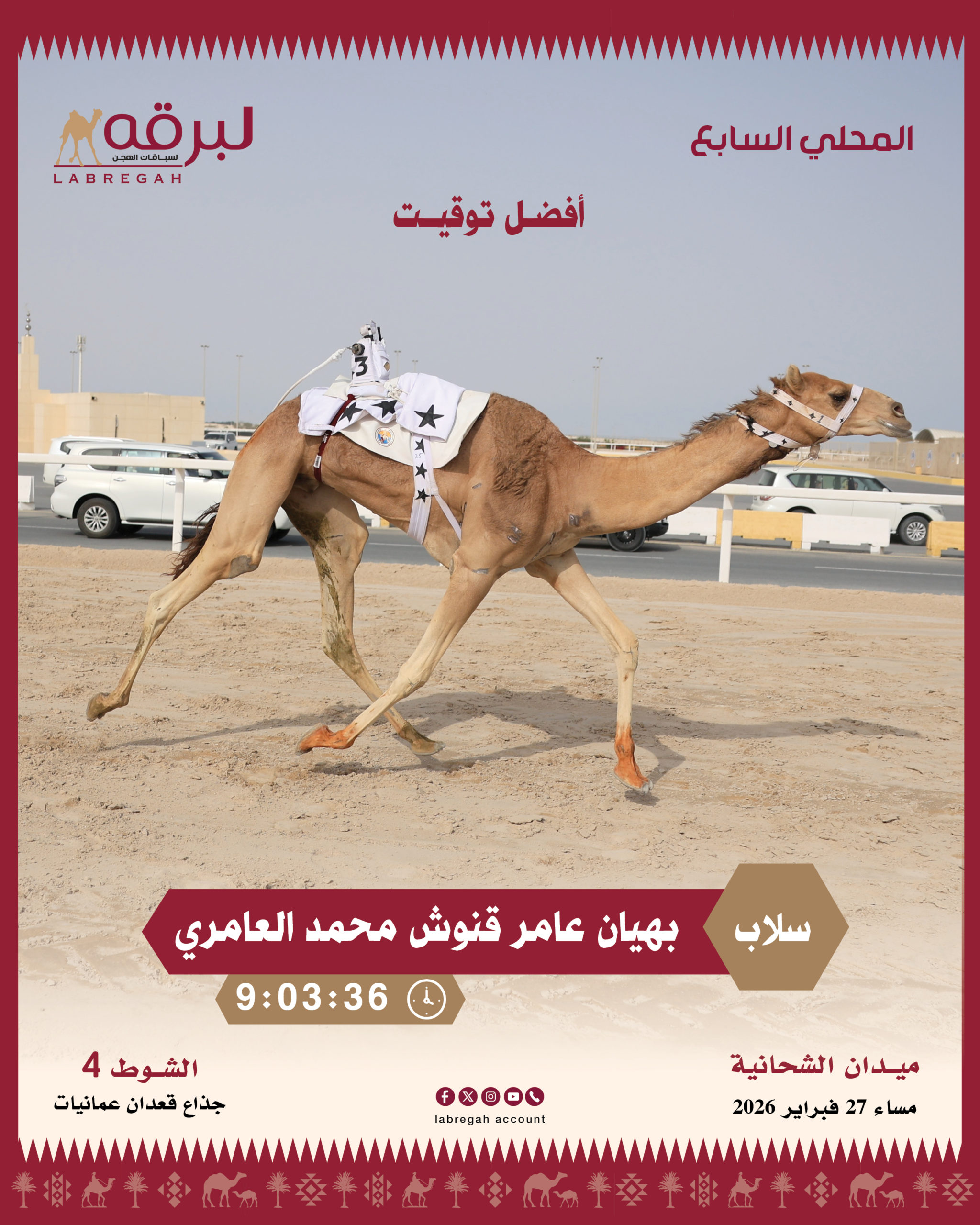 أما أفضل توقيتات الأمسية فذهب مع “سلاب” ملك بهيان عامر قنوش محمد العامري، بعد فوزه بناموس الشوط الرابع للقعدان مفتوح، حيث قطع مسافة الـ 6 كم في زمن قدره 9.03.36 دقيقة.