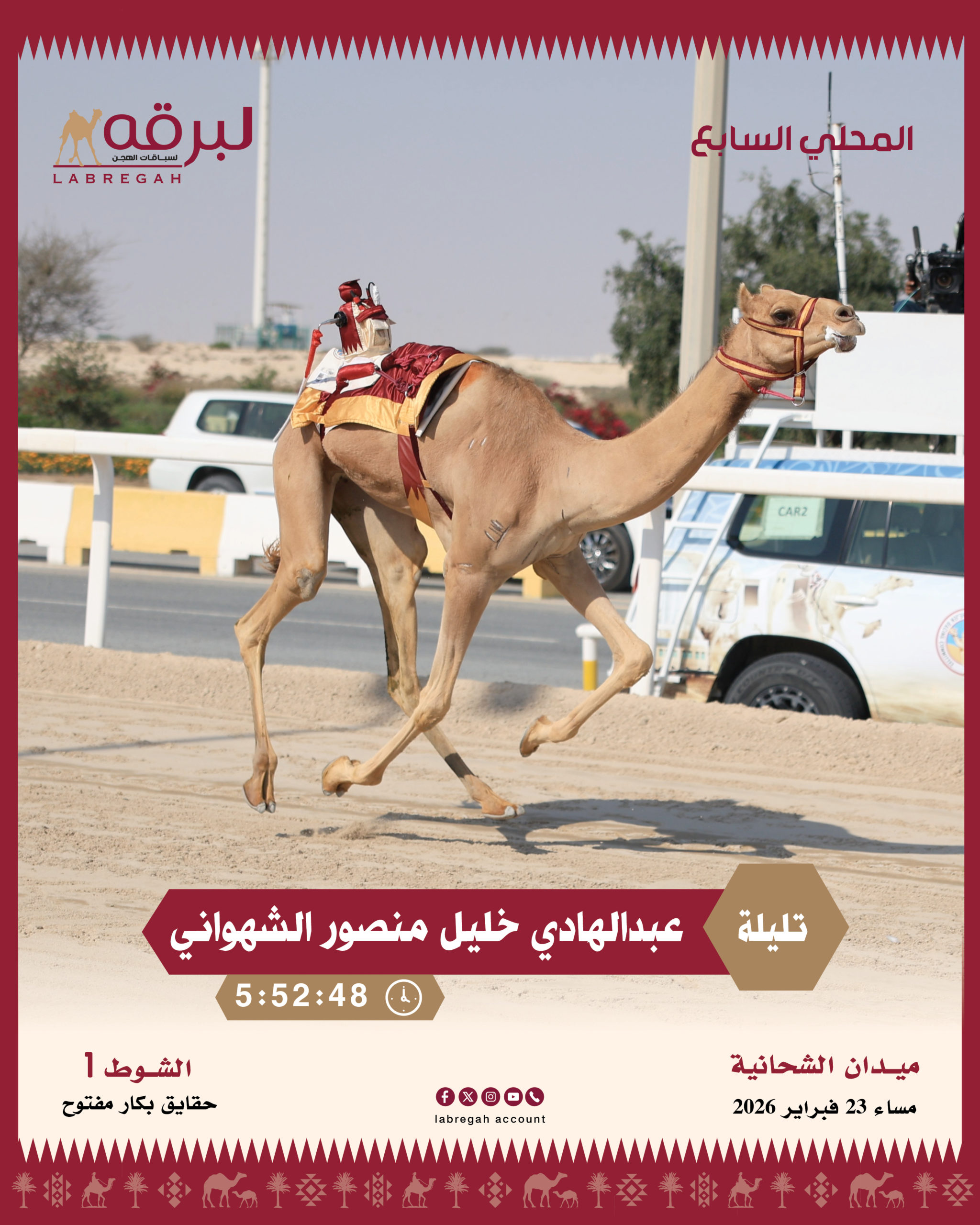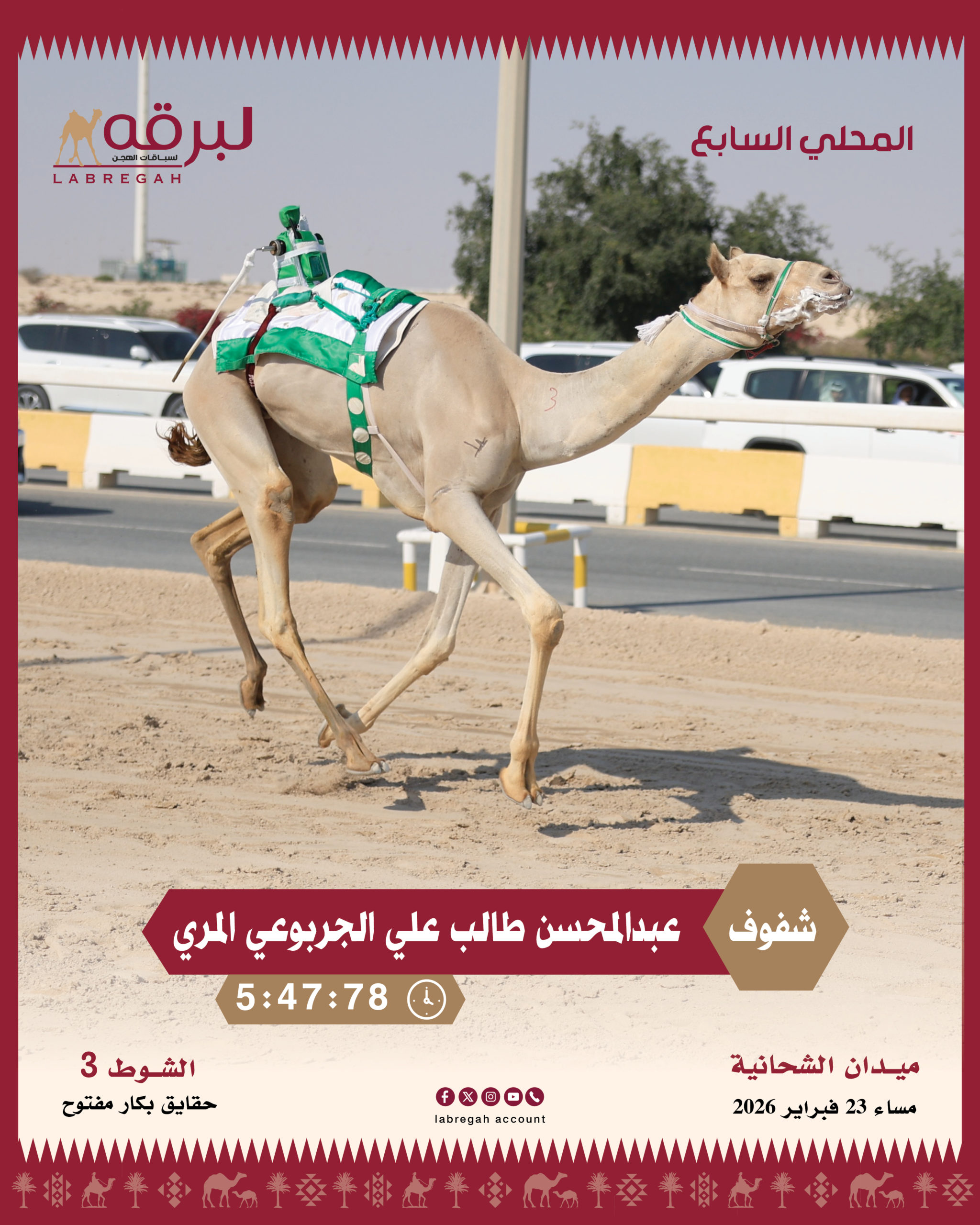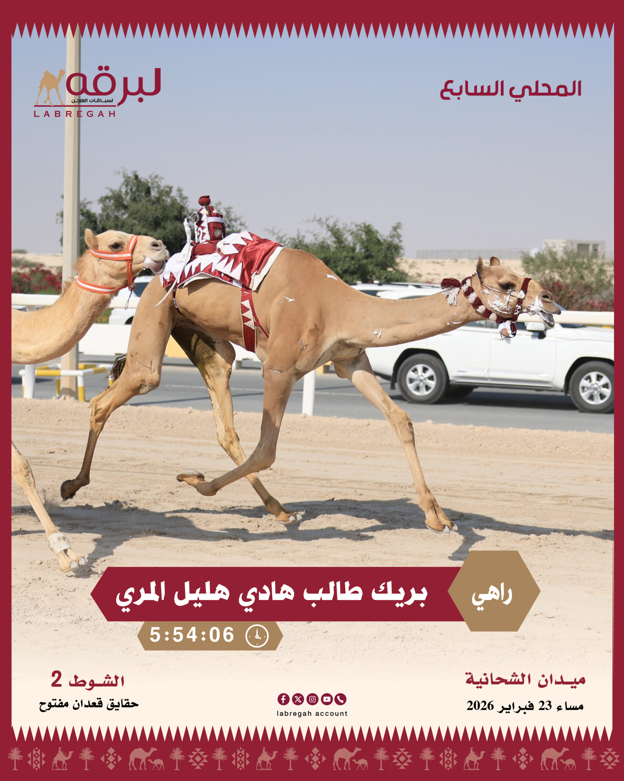 تواصلت الانطلاقات مساء اليوم الإثنين 23 فبراير 2026، ثاني أيام المرحلة الثانية من السباق المحلي السابع، والتي خصصت لسن الحقايق العامة، وذلك على مدار 18 شوطًا من مسافة أربعة كيلومترات.