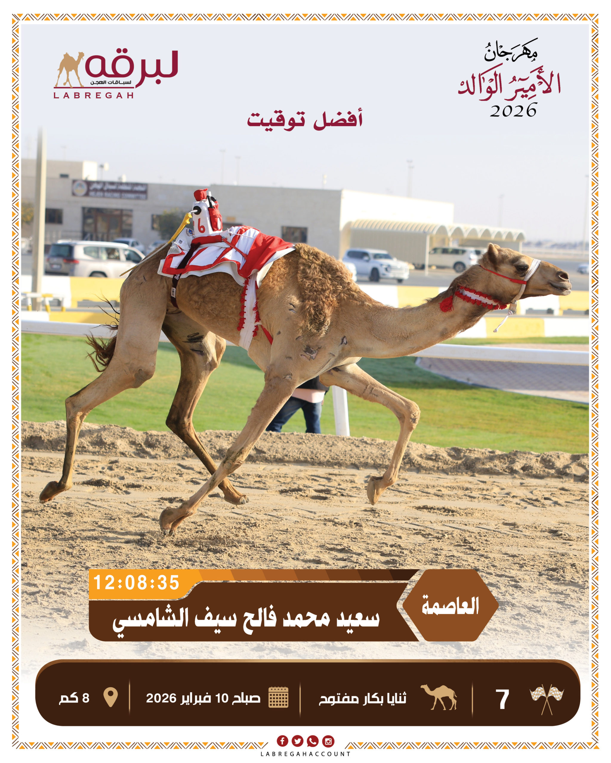 أما أفضل توقيت سُجل في منافسات الفترة الصباحية، فكان من نصيب «العاصمة» المملوكة لسعيد محمد فالح سيف الشامسي، التي حصدت ناموس الشوط السابع بزمن قدره 12.08.35 دقيقة.