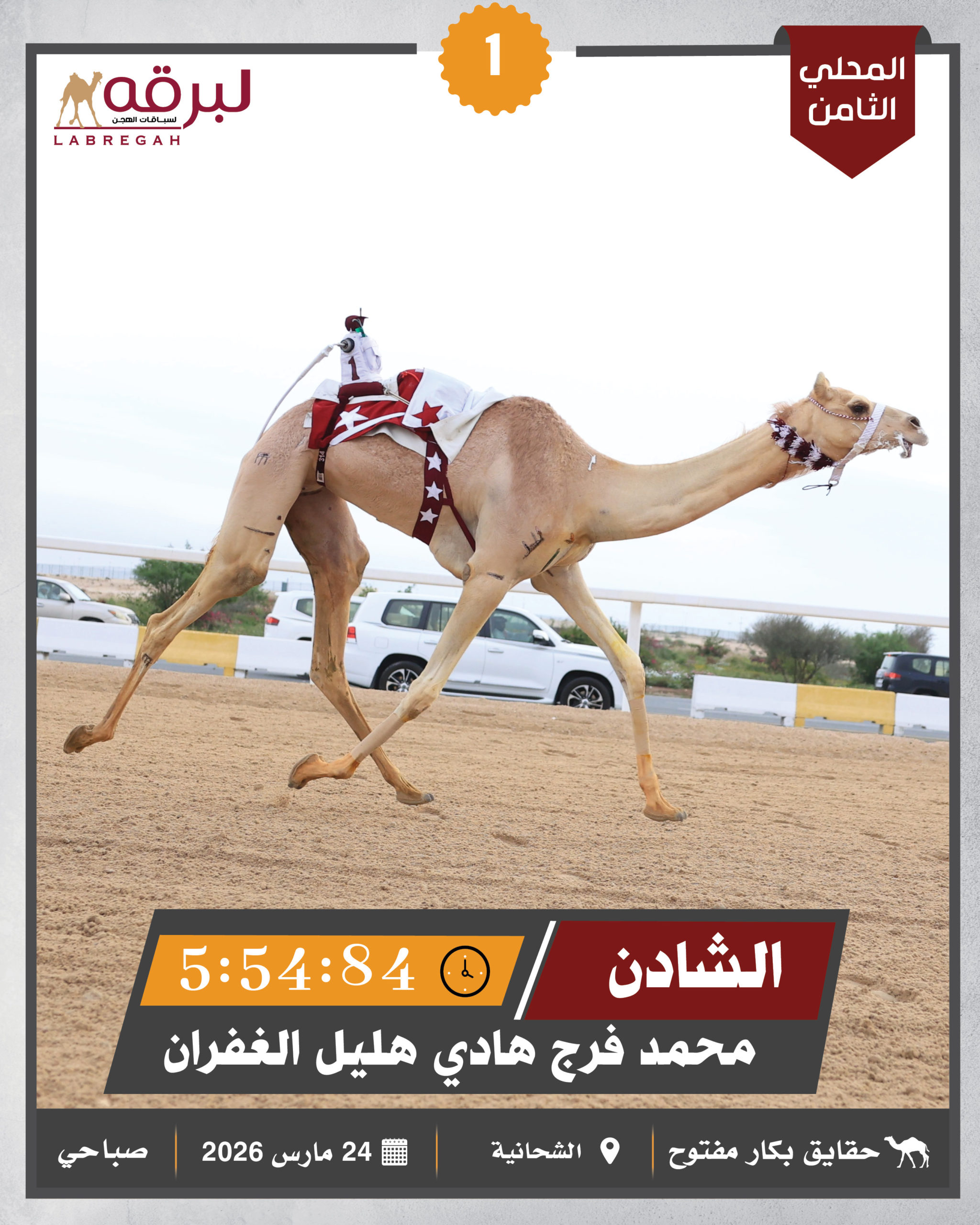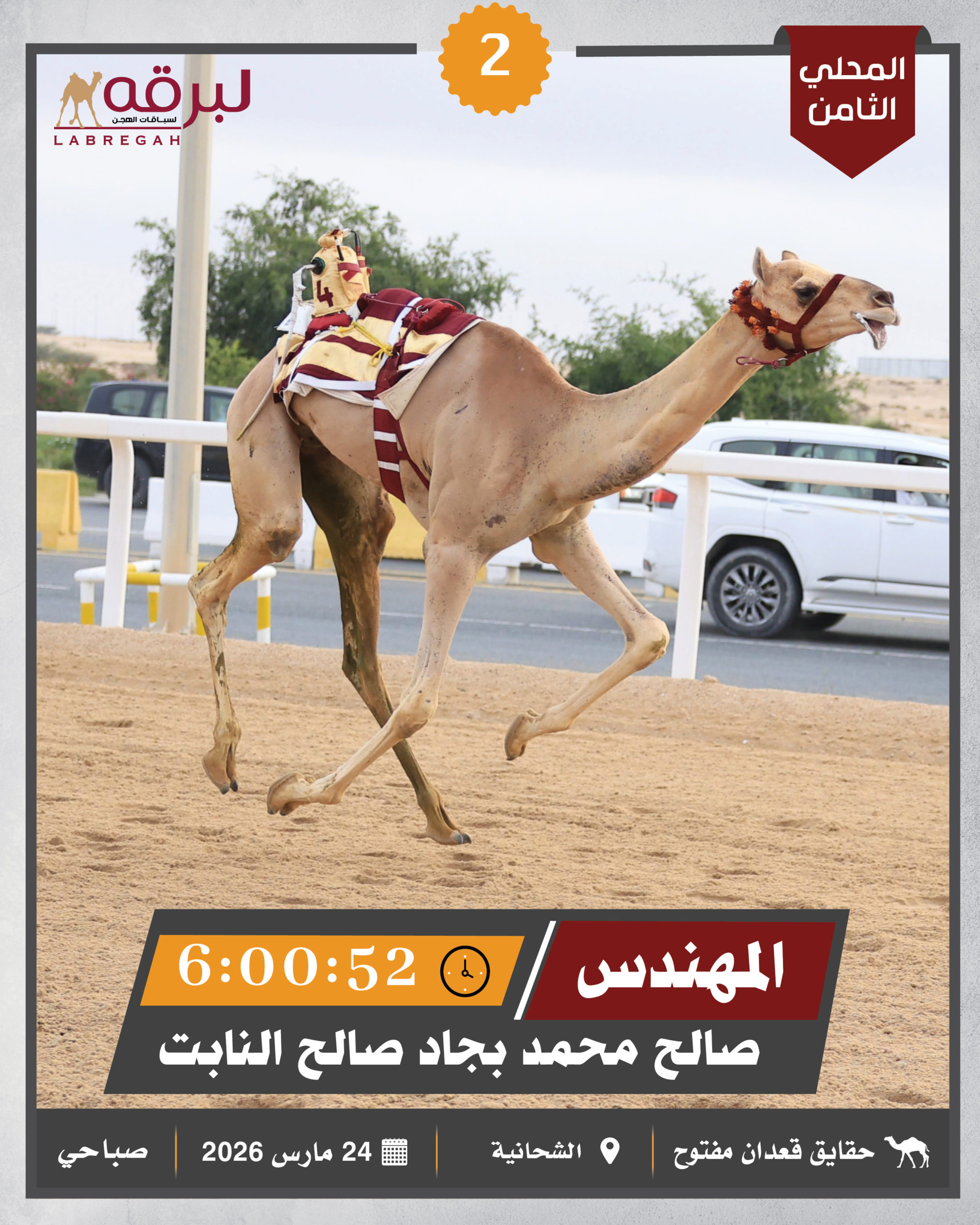 انطلقت صباح اليوم الثلاثاء 24 مارس 2026، فعاليات المرحلة الثانية من السباق المحلي الثامن، والتي خصصت لسن الحقايق من هجن أبناء القبائل، بواقع 30 شوطًا لمسافة 4 كم، بمشاركة 1092 بكرة وقعود.