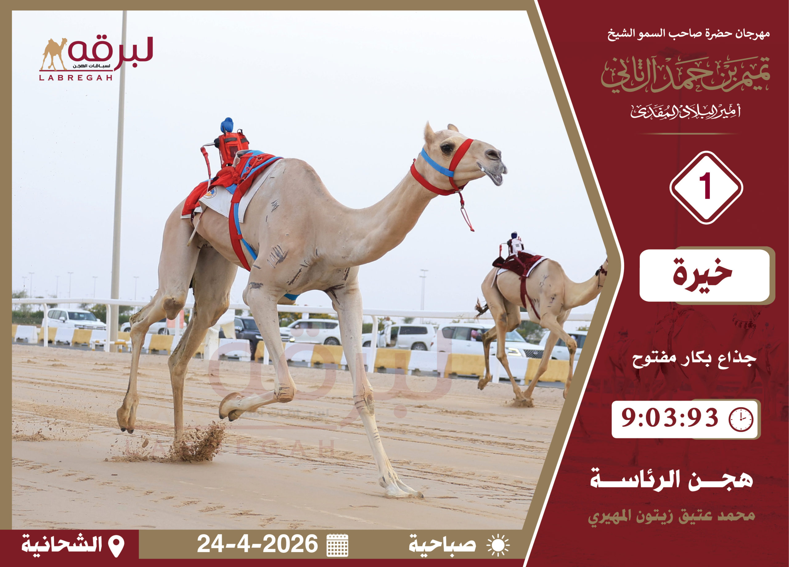 | بكار مفتوح | 2 | نهب | هجن الشحانية | محمد بن خالد العطية | 9:03:66 |