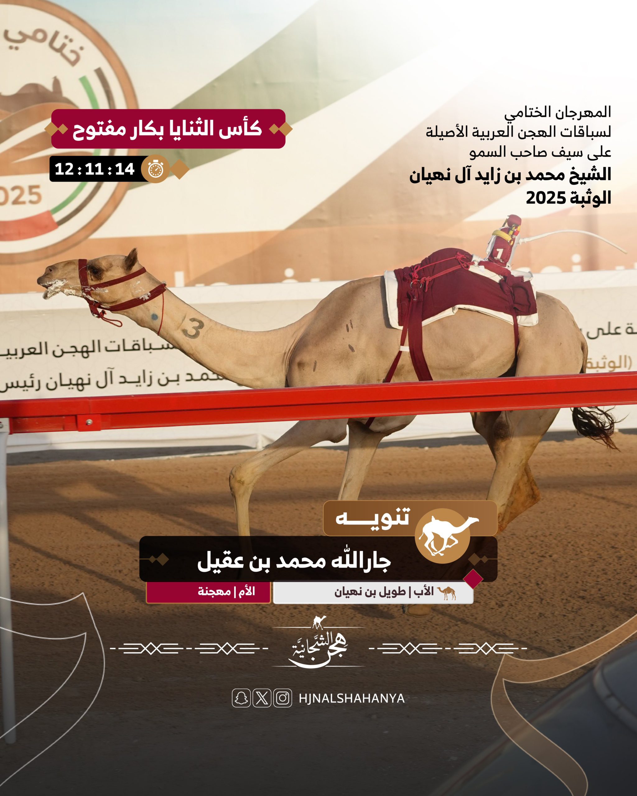 بعد أن انحسرت المنافسة في الـ 100 متر الأخيرة من أقوى أشواط الثنايا البكار المفتوحة بين نخبة من هجن الرئاسة مقابل ثنية وحيدة لهجن العاصفة، أصدرت “تنويه” ملك هجن الشحانية بياناً يقول بأن الشوط شوطي والكأس هي مرادي، لتنطلق بسرعة البرق نحو المركز الثالث ثم الثاني ثم الأول وتتصدر المشهد حتى خط النهاية، وذلك تحت إنظار المضمر البرنس جارالله محمد بن عقيل، الذي رافقها باقتدار وتكتيك محكم لانتزاع هذه الكأس الذهبية بأداء استثنائي.