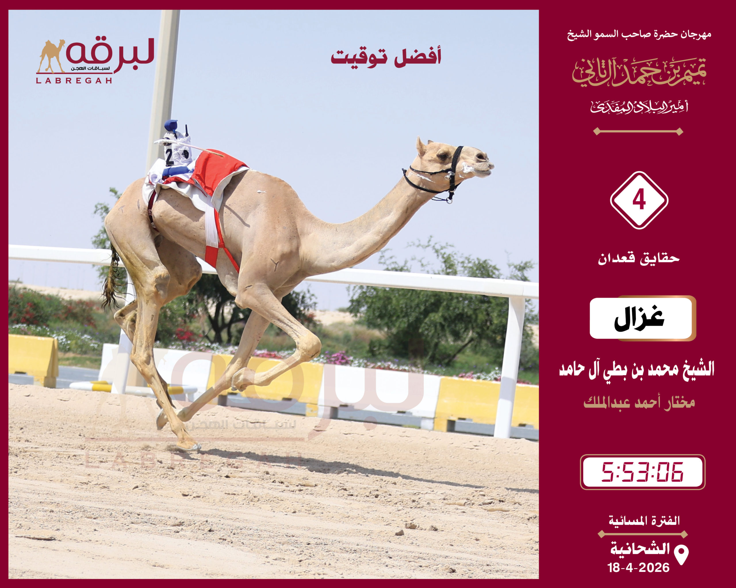 أما أفضل توقيت سجل في منافسات الأمسية فكان مع “غزال” المملوك للشيخ محمد بن بطي آل حامد، حيث قاد “غزال” المضمر مختار أحمد عبدالملك لانتزاع ناموس الشوط الرابع وحصد الجائزة المالية وقدرها 100 ألف ريال، حيث قطع “غزال” مسافة الـ 4 كم في زمن قدره 5.53.06 دقيقة.