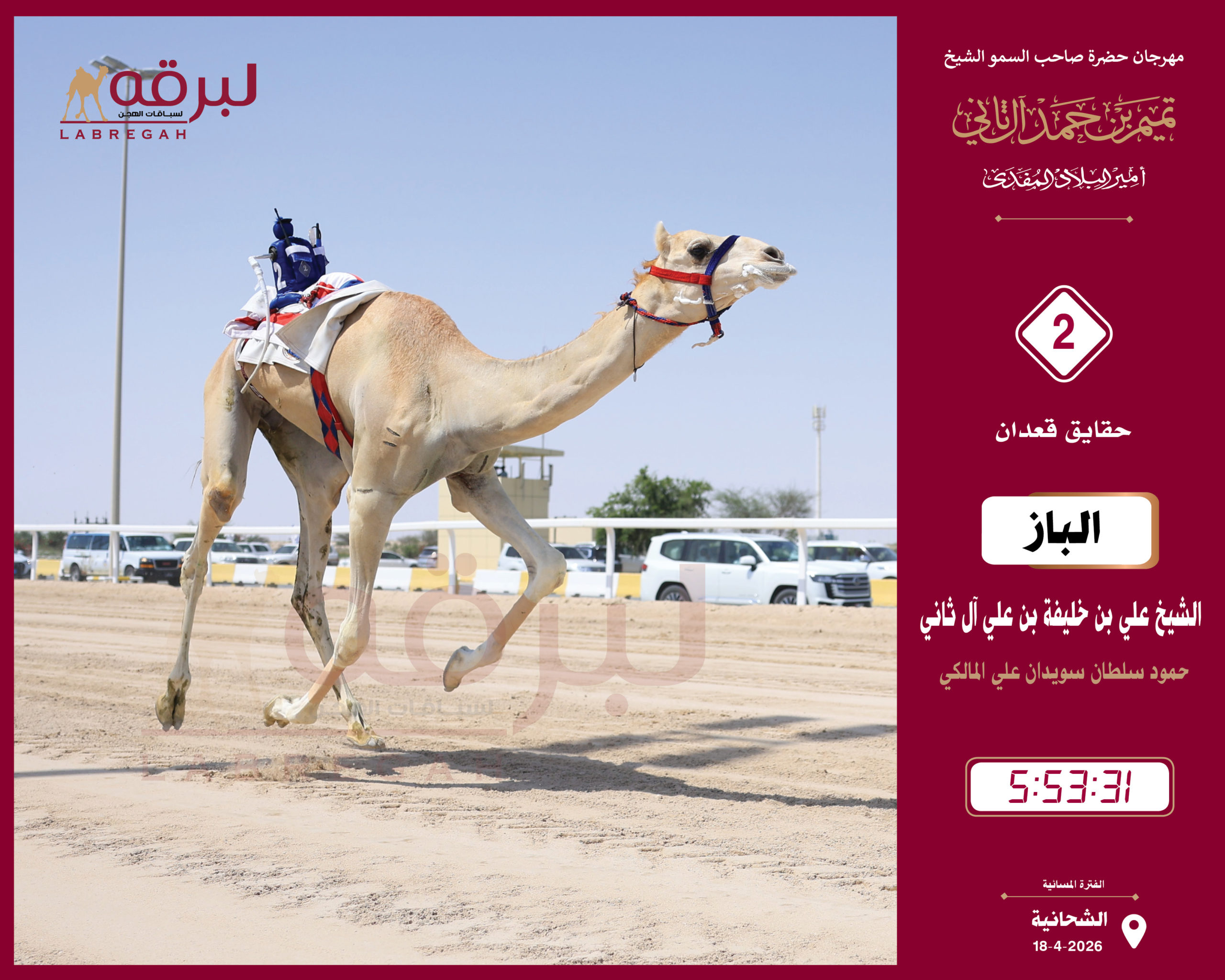 | قعدان مفتوح | 2 | لاهوب | هجن الغرافة | سالم عامر راشد المدهوشي | 5:55:07 |