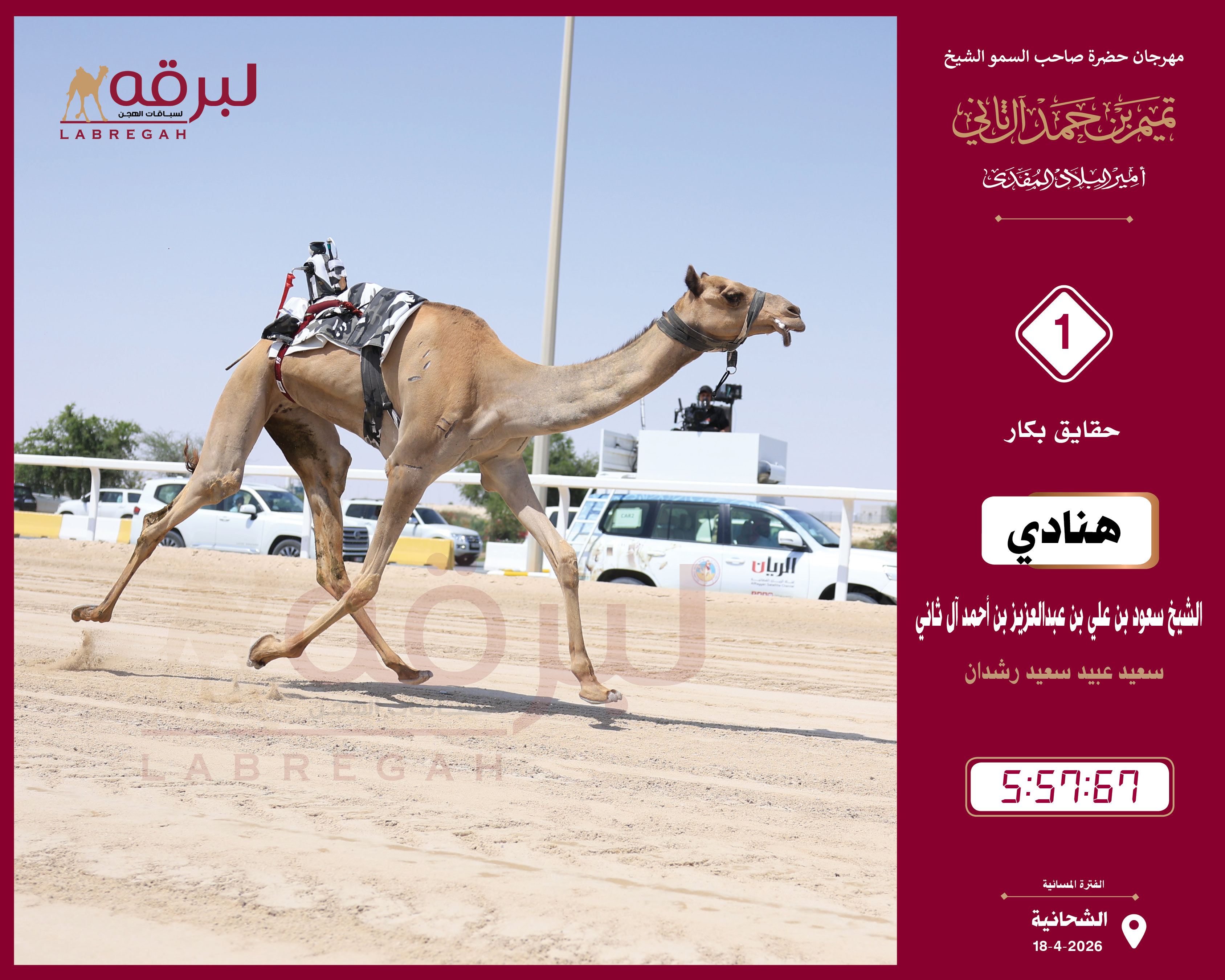 | الشوط الخامس | 1 | عوايد | الشيخ عبدالعزيز بن حمد بن خالد آل ثاني | حمد طالب بن عماره | 5:54:07 |